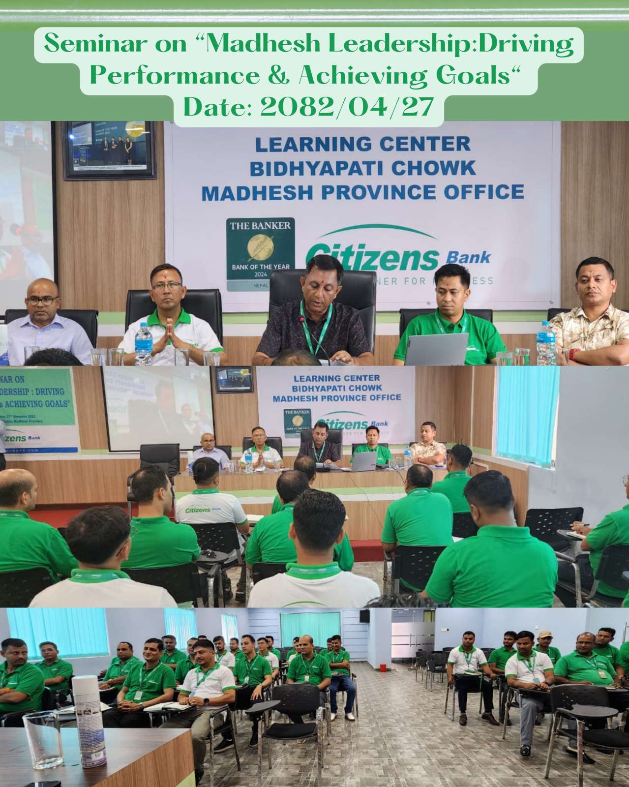 सिटिजन्स बैंक इन्टरनेसनल लिमिटेडले मधेश प्रदेशमा आफ्ना शाखा–प्रबन्धक तथा अन्य सहकर्मीहरू माझ “मधेश लिडरसिप्ः ड्राइभिङ्ग पर्फरमेन्स एण्ड अचिभिङ गोल्श”सम्बन्धी सेमिनार आयोजना गरेको छ । सो सेमिनार बैंकका प्रमुख कार्यकारी अधिकृत श्री गणेशराज पोखरेल ,उप–प्रमुख कार्यकारी अधिकृत र वरिष्ठ कार्यकारीहरूका उपस्थितिमा सम्पन्न भएको छ । सेमिनारमा चालु आर्थिक वर्षका स्थानीय प्राथमिकताहरूमा सहमति जुटाउँदै केन्द्र र प्रदेश बीच सहकार्य सुदृढ गर्ने विषयमा गहिरो अन्तर्दृष्टि आदान–प्रदान भएकोे छ । मधेश केन्द्रित भएको यो कार्यक्रम जस्तै अन्य प्रदेशमा पनि प्रदेश स्तरमा कार्यक्रम गरिने योजना बैंकले जनाएको छ । सिटिजन्स बैंक इन्टरनेसनल लिमिटेडले आर्थिक वर्ष २०८१÷८२ को असार मसान्तसम्म कर्जा, निक्षेप, खुद ब्याज आम्दानी जस्ता सूचकमा दोहोरो अंकको वृद्धि गर्दै कोषको लागत घटाउने, बेस रेट कम गर्ने तथा कर्जा जोखिम व्यवस्थापनमा उल्लेखनीय सुधार गर्ने सफलता हासिल गरेको छ ।
