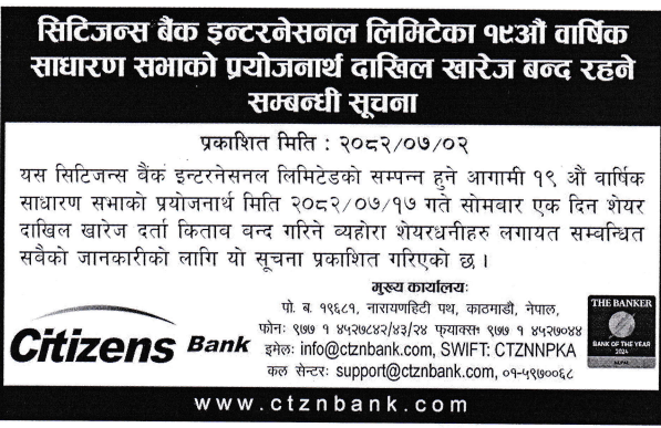 उक्त सुचना मिति २०८२/०७/०२ को राष्ट्रिय दैनिक कारोवार पत्रिकामा प्रकाशित गरीएको ब्यहोरा समेत जानकारी गराउँदछौ ।