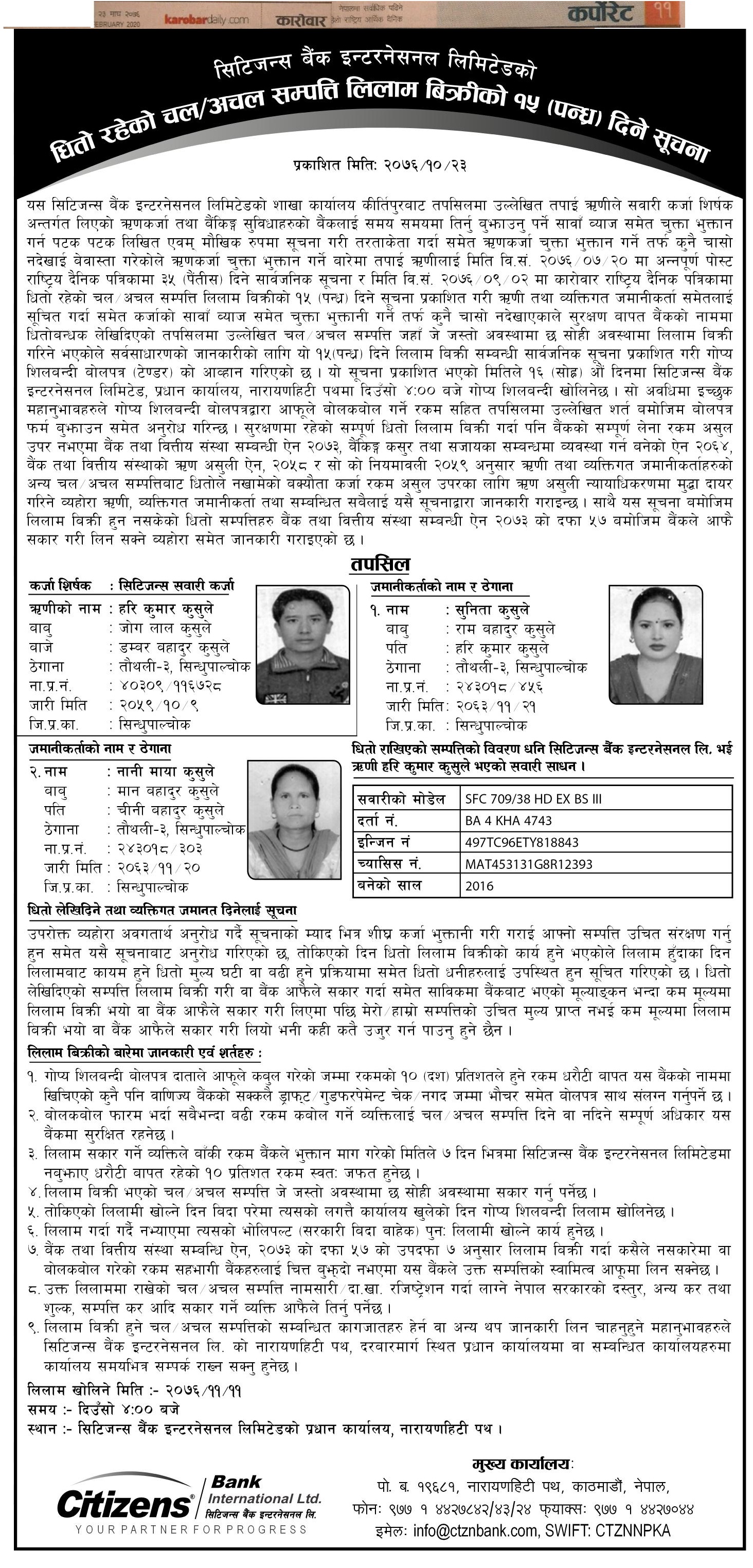 Hari Kumar Kusule- 15 days auction notice published on Karobar National Daily on 2076.10.23