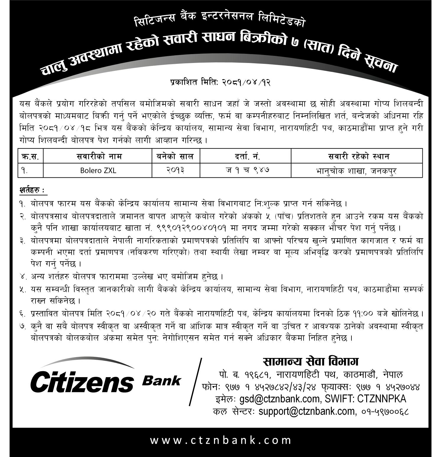 Invitation for Bids for sale of Office Vehicle "Bolero ZXL"